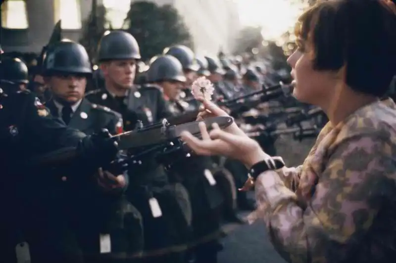 Молодой пацифист Джейн Роуз Кэсмир, с цветком на штыках охранников в Пентагоне. Во время протеста против войны во Вьетнаме. 1967 год.