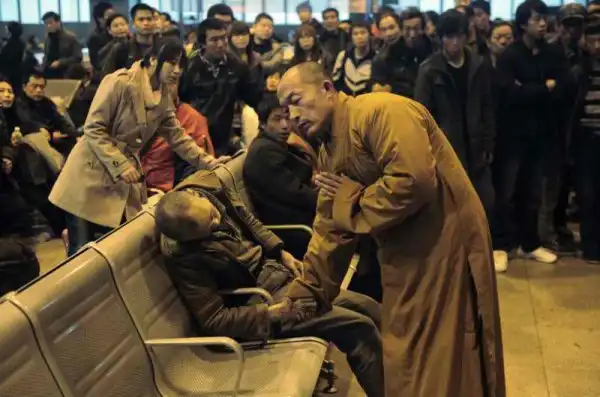 Монах рядом с пожилым человеком, который внезапно умер, ожидая поезда в Шаньси Тайюань, Китай.