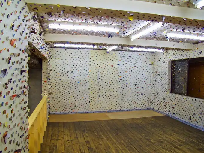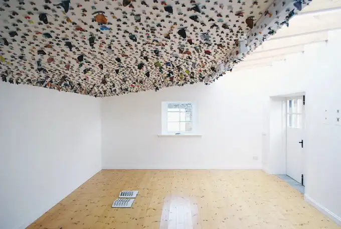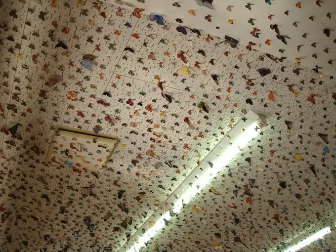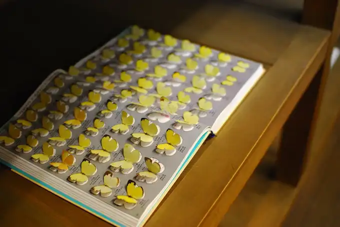 Художник вырезал каждую бабочку из книжных иллюстраций и дал им новую жизнь, изящно прикрепив каждую к стенам и потолкам. Рой всех видов видов бабочек заполнил комнату в этой инсталляции.