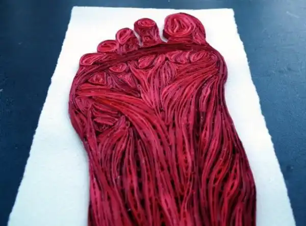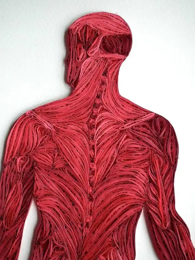 Сара Якавонис (Sarah Yakawonis) – дизайнер из Портленда. В списке ее интересов, помимо ожидаемых пунктов «оформительское искусство», «бумажные техники» можно увидеть «анатомические атласы», «эстетику отвратительного» и «медицинские тексты». Неудивительно, что наряду с типовым декоративным использованием квиллинга в оформлении открыток, обложек и печатных текстов в ее портфолио обнаруживаются серии «Мышечный скелет тела»и «Система кровообращения головы».