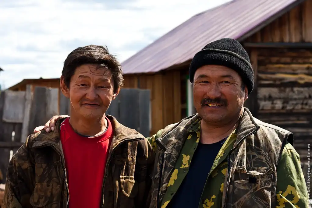 23. Николай (слева)- коренной житель Куюмбы. Занимается изготовлением деревянных лодок. Наобещал сделать лодки многим, мешают этому постоянные запои.