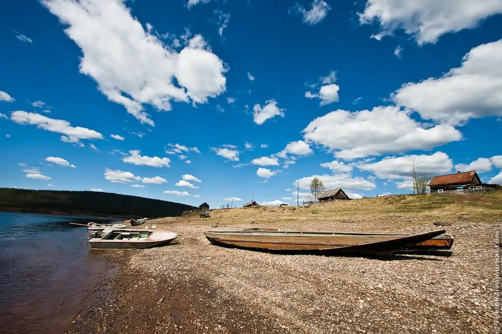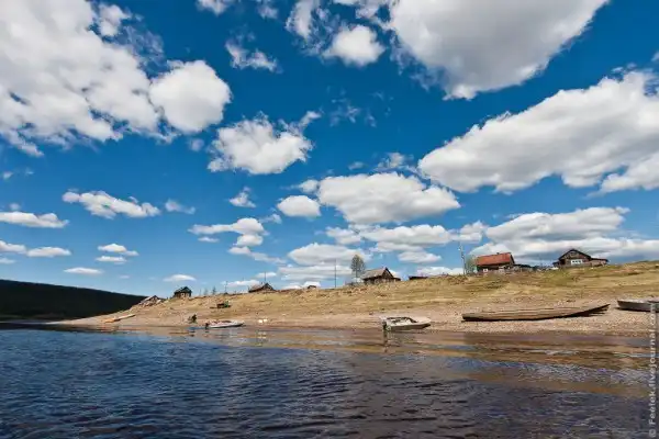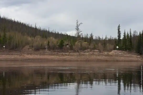 5. Весь путь в одну сторону занял у нас целый день. По пути встретилась всего одна деревня - Куюмба и несколько небольших поселений. Однако периодически по берегу попадаются охотничьи избушки. Охотники бывает уходят на промысел на несколько недель, а то и месяцев. Территория их участков огромна, поэтому приходится строить несколько избушек. Всегда есть главная, в которой охотник проводит большую часть времени. Такие избушки называют "базами".