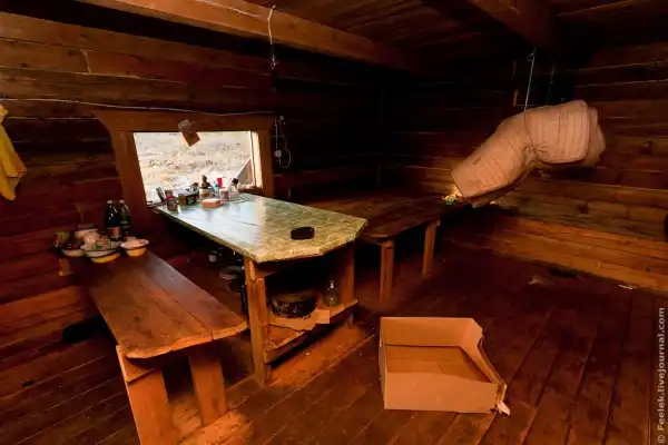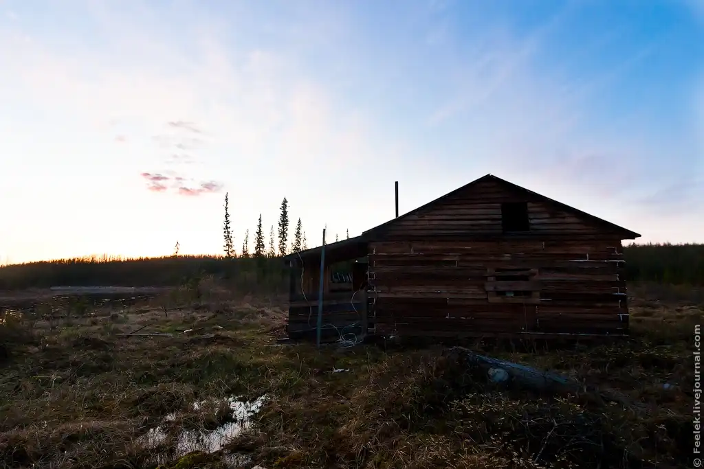 45. Под вечер наконец добираемся до места ночлега - одной из охотничьих избушек на реке Камо.
