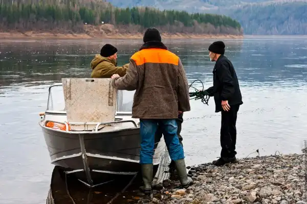 3. Загружаем вещи в моторную лодку и отплываем.
