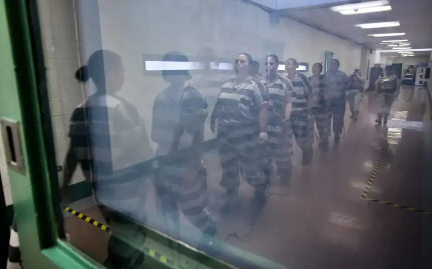 13. Одна из заключенных, Джулии Харпер (на фотографии по центру), участница единственной в Соединенных Штатах Америки группы кандальников-рабочих. Фотография сделана рано утром в тюрьме округа Марикопа «Maricopa County’s Estrella Jail» в Фениксе, штат Аризона.