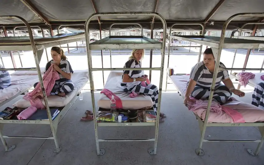 4. Большинство женщин, входящих в состав этой группы кандальников-рабочих, сидят в тюрьме за незначительные правонарушения – управление автомобилем в состоянии алкогольного опьянения или под действием наркотиков, нарушение условий условно-досрочного освобождения. Примечательно то, что большинство их них даже содержат не в основном здании тюрьмы, а в так называемом «палаточном городке» – лагере из военных палаток, который расположен рядом с тюрьмой округа Марикопа «Maricopa County’s Estrella Jail». Этот палаточный городок создан с целью уменьшить нагрузку на переполненный тюремный корпус.