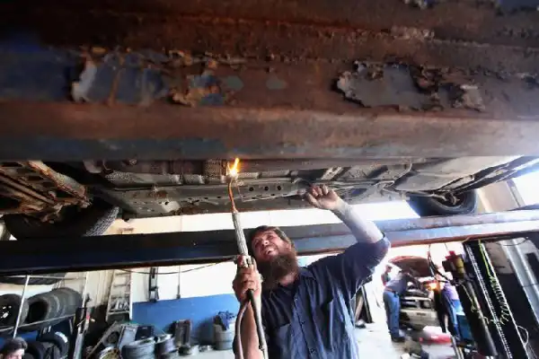 (Механик Чак Оливер сваривает трубы в его собственной авторемонтной мастерской.)