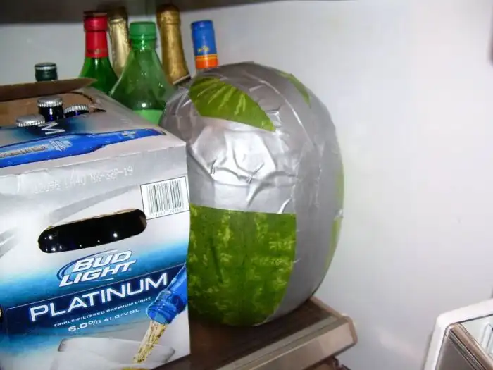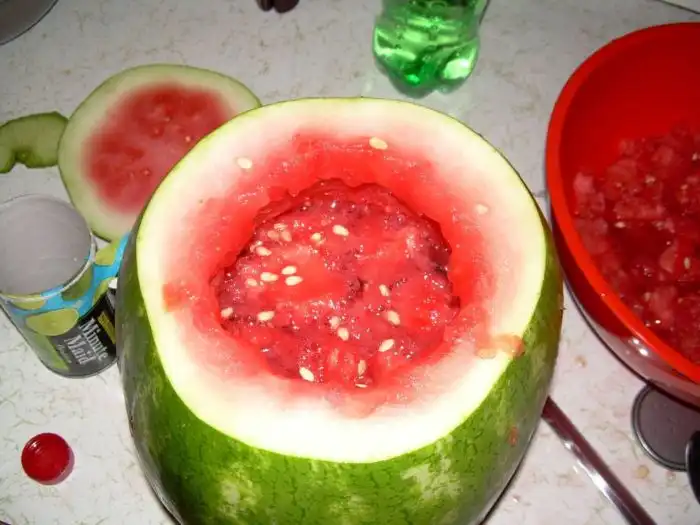 Затем вливаем взбитую мякоть в арбуз и замораживаем.