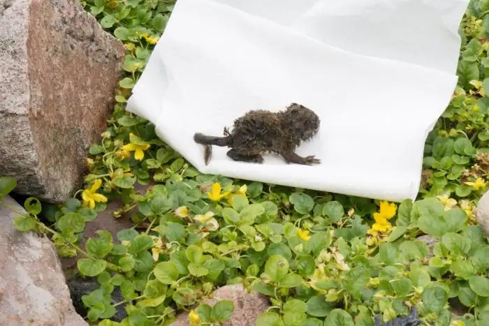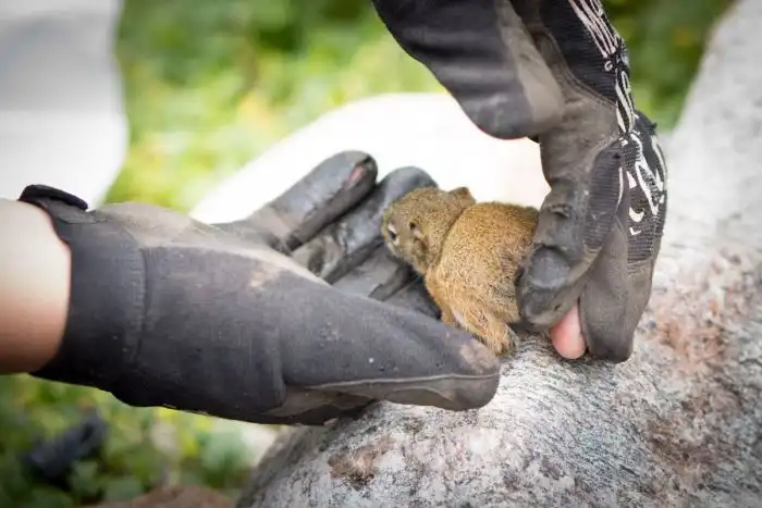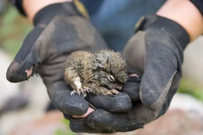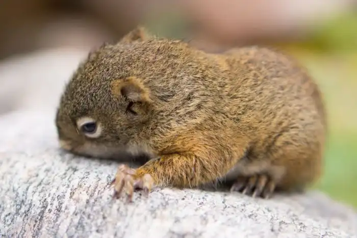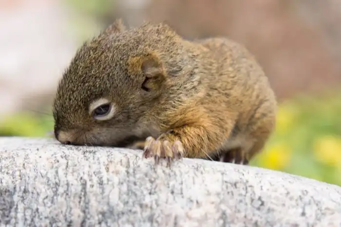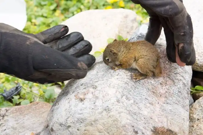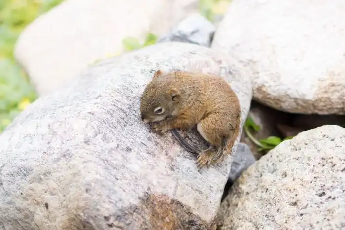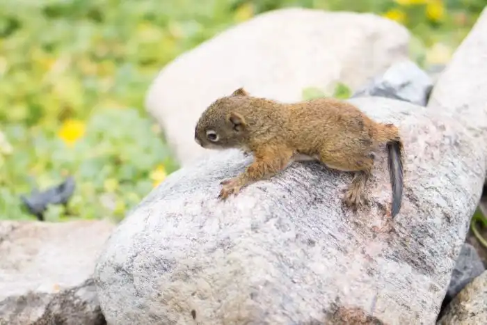 Крохотный бельченок провалился между камнями на берегу ручья,