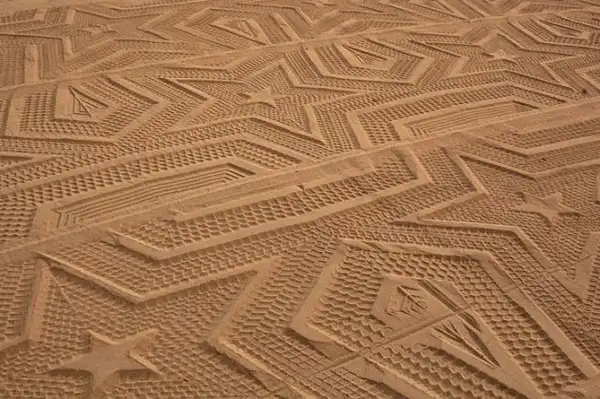 Для создания узора на одном из пляжей Малаги художница Гунилла Клинберг вырезала узор на огромном резиновом цилиндре. Цилиндр был прикреплен к трактору, катаясь на нем по пляжу Гунилла создает огромные узоры.