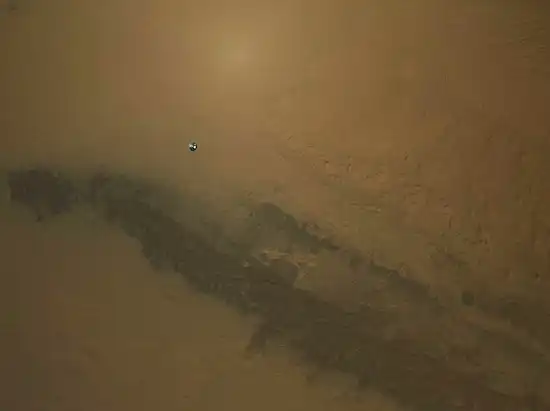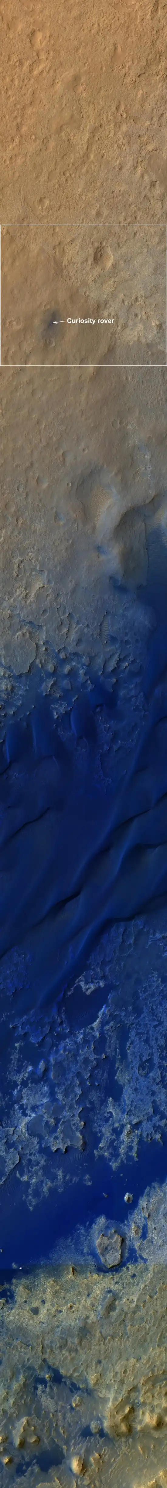 Цветовая гамма была искусственно расширена, чтобы выявить тонкие различия в ландшафте: синим показываны тёмные поля дюн.