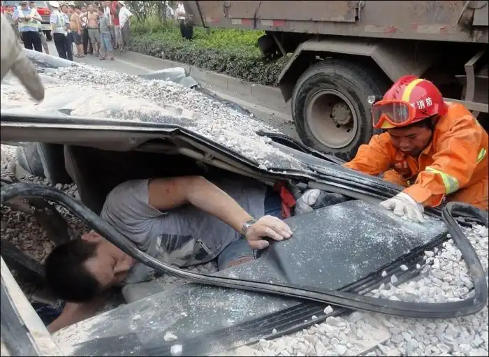 который оказался замурованным в своем сплющенном от веса щебня автомобиле.