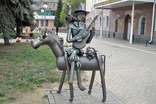 6. Этот Странный памятник, который сделан из водосточных труб, посвящен мультфильму про Бременских музыкантов. Оригинальность в подходе к выполнению впечатляет.)