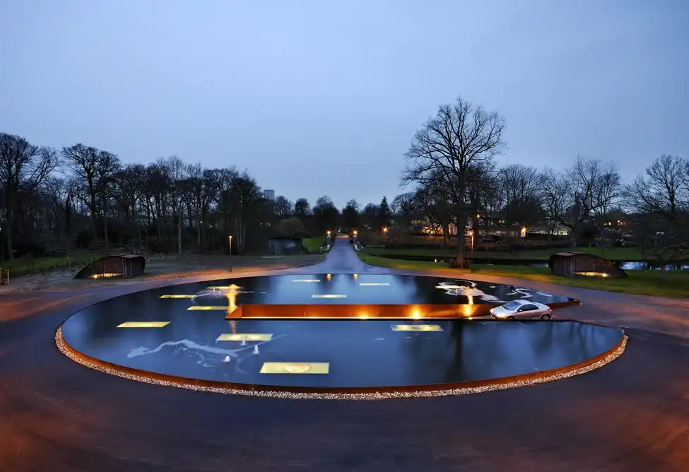 Комплекс апартаментов Voorhuis представлен 60 резиденциями различного размера. На каждую из них предусмотрено два места на подземном паркинге. Непосредственно над ним и был создан декоративный водоем площадью 730 кв.м. Глубина пруда составляет 60 сантиметров, а въезд на паркинг разделяет его на две части. Цветные стеклянные отверстия излучают свет, которые пробивается из под земли. А специальные фонтаны, работающие с небольшим интервалом, создают движение воды. Таким образом, поверхность пруда играет и светится, пруд зачаровывает своей красотой. Его оформлению архитекторы уделили наибольшее внимание, работая над ландшафтным дизайном прилегающей территории.