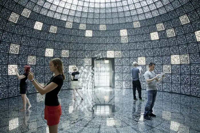 внутри которого все стены заполнены периодически светящимися QR-кодами.