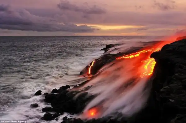 На этом снимке запечатлен фотограф Nick Selway во время извержения вулкана Kalapana, Hawaii.