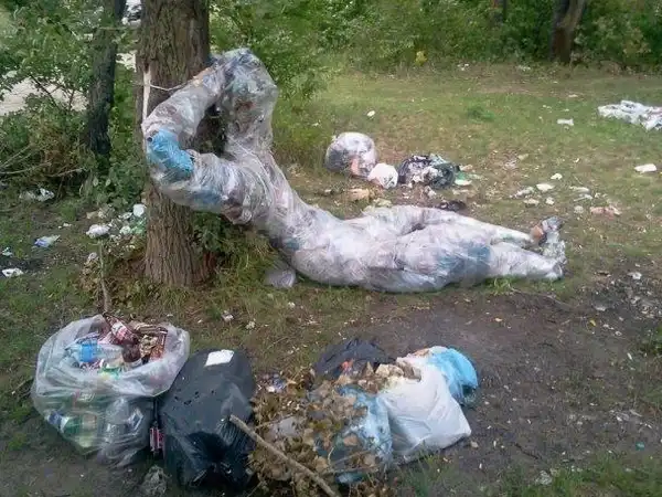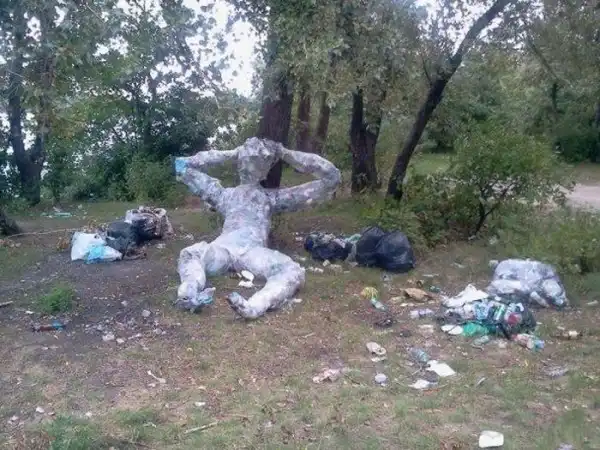 Под Московским мостом в Киеве появилась скульптура человека, сделанная из мусора. Для изготовления "шедевра" неизвестный скульптор собрал весь мусор на берегу, который в течение лета оставили недобросовестные посетители. Из пустых пластиковых бутылок и стеклянной тары из-под пива и водки мастер изготовил тело, руки, ноги и голову фигуры, скрепив части между собой пищевой пленкой.