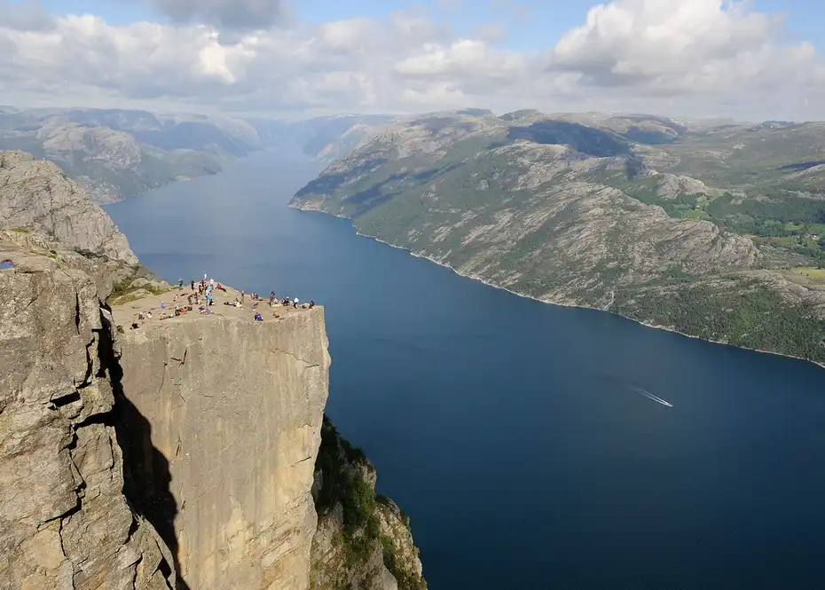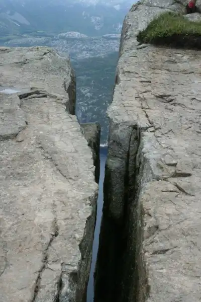 Несмотря ни на что на вершине Прекестулена нет абсолютно никаких ограждений. Поэтому самые смелые могут поболтать ногами над пропастью. Но подойти к краю решаются далеко не все гости Прекестулена