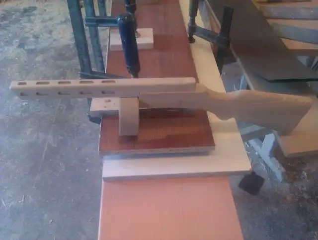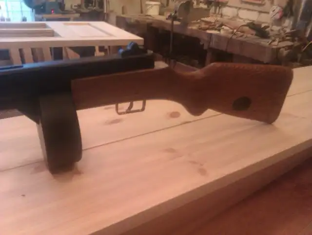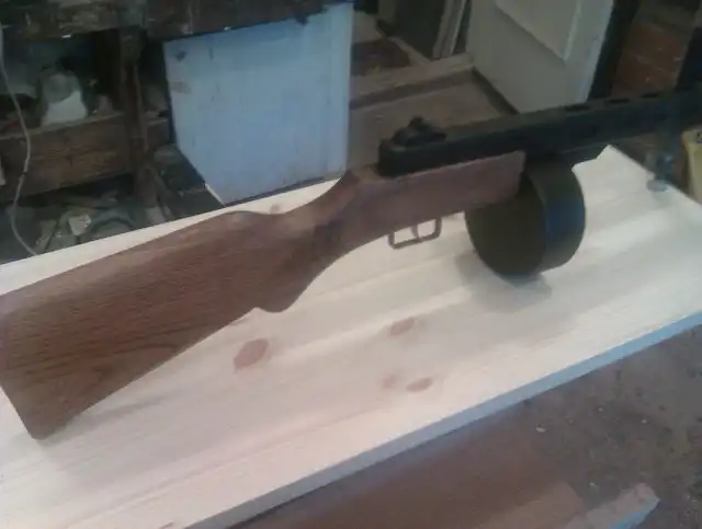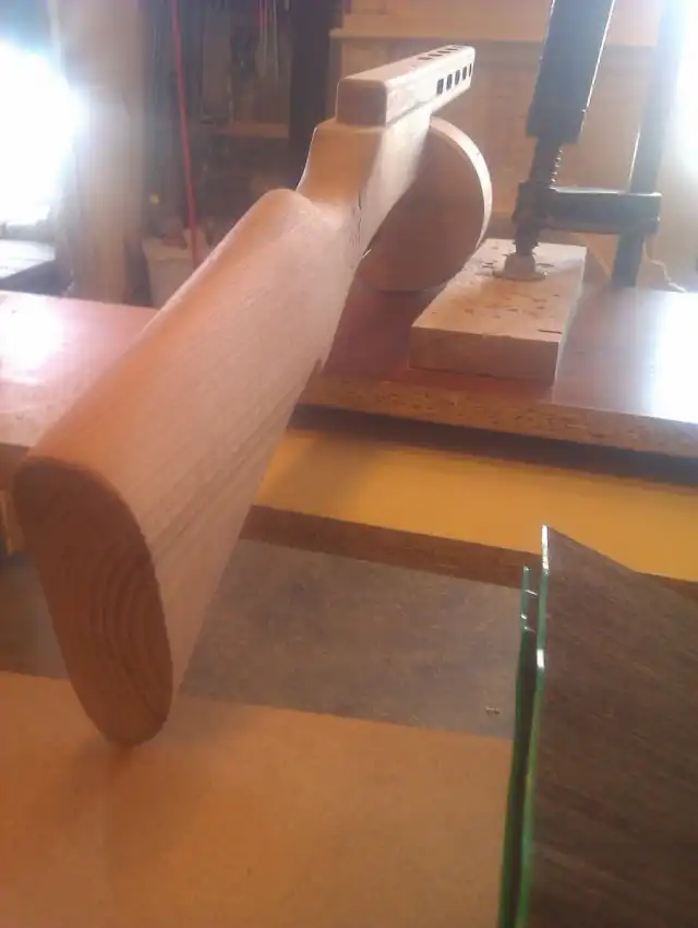 Из него всё и изготовлено. Нарисовал приблизительно на куске картонки и вырезал по контуру. Наложил не заготовку и вырезал из цельного куска приклад с цевьём. Зажал в тисочки и принялся строгать "ласточкой", или как там она называется.