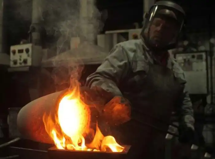 выплавляют золотые слитки на одном из заводов Австрии.