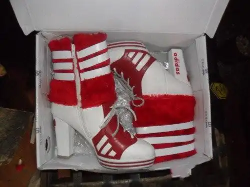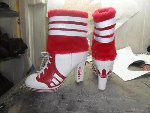 Полоски вверху, и для недогадливых лейблы на каблук. Бренд написан маркером.