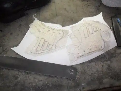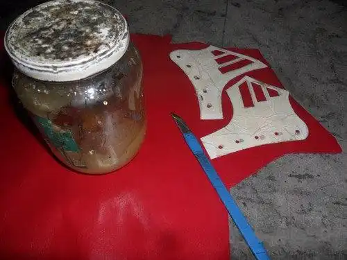 Получившиеся лекала приклеиваю резиновым клеем на кожу типа "шевро" (тонкая козлинка).