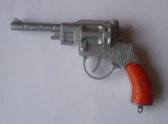 Этот стрелял вот этими дисками. Когда они все, наконец, потерялись, я стал стрелять из него двухкопеешными монетками - они в точности подходили по размеру, но для этого мне пришлось разорить весь родительский запас "двушек", собираемых для звонков по таксофону... Задницу мне надрали знатно. Кстати, до сих пор помню цену данного пистолета - 2 р. 50 коп., да.
