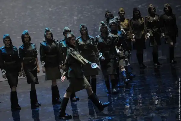Девушки выходили на сцену в разных нарядах, в том числе и в сапогах и военной форме.