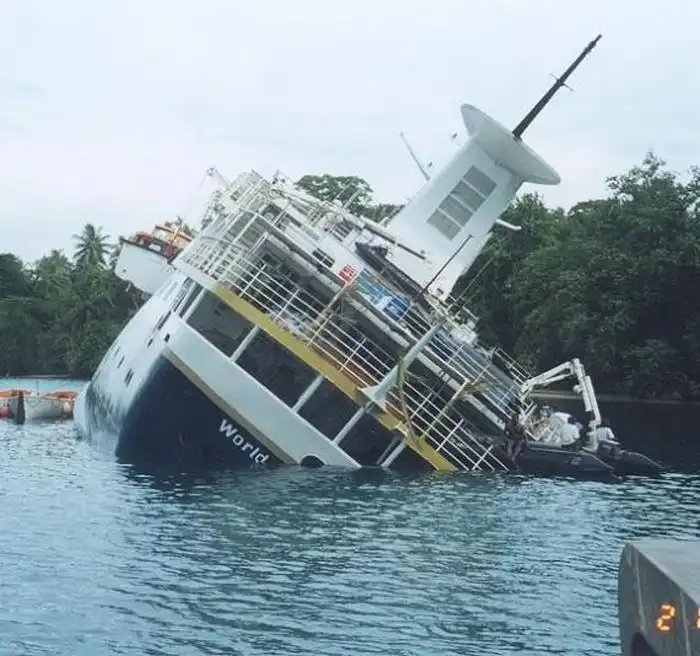 World Discoverer был построен в 1974 году. В 2000м он напоролся на риф и затонул близ Соломоновых островов.