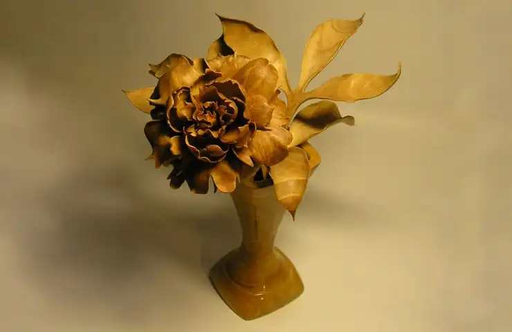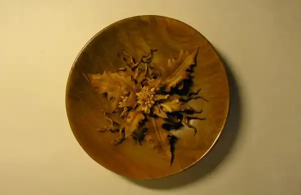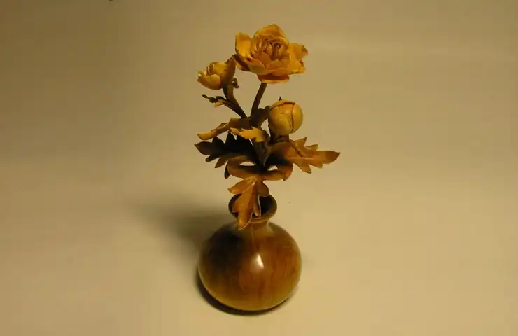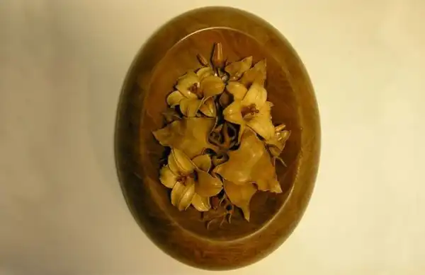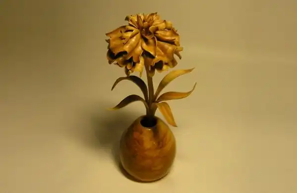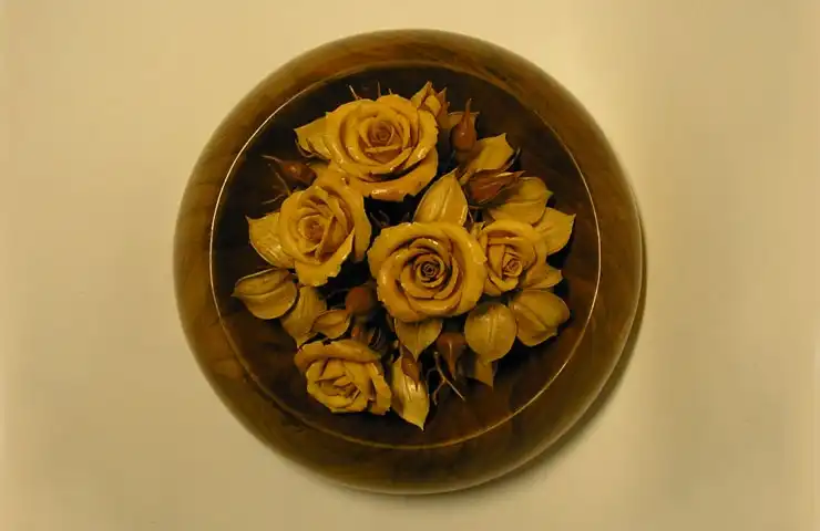 Изделия не вырезаются из цельного куска, а представляют собой композиции из отдельных, идеально подогнанных друг к другу, составляющих из различных пород дерева (береза, карагач, осина, махагони и т.д.).