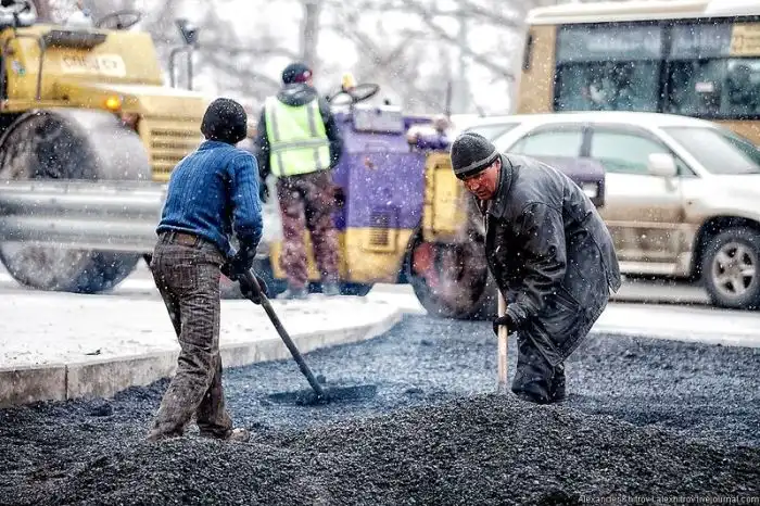 Конечно же, ложить новый асфальт во время снега намного приятнее,