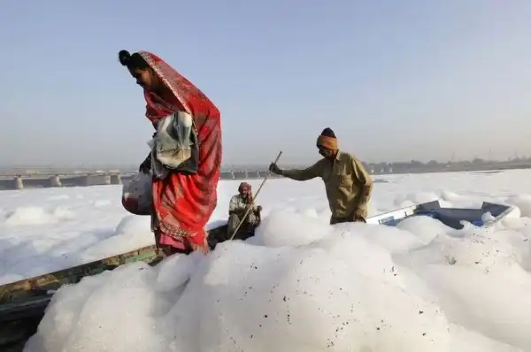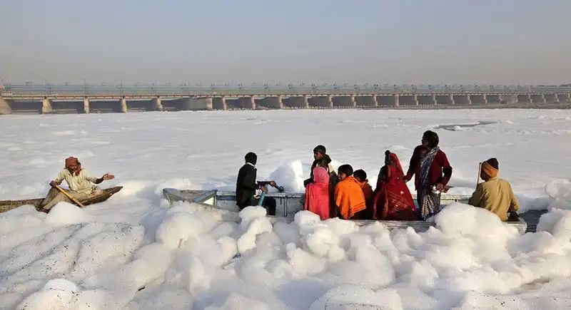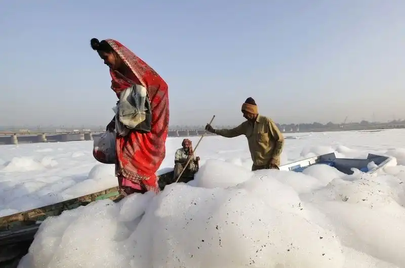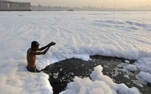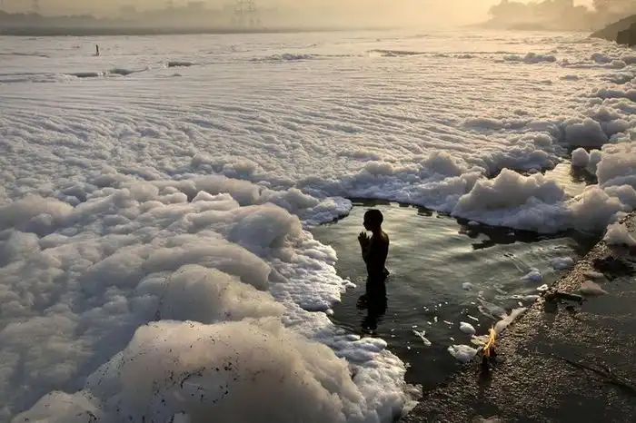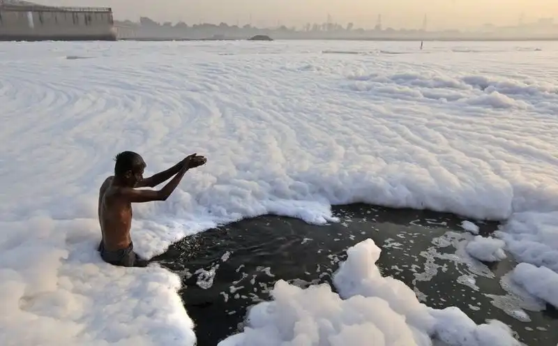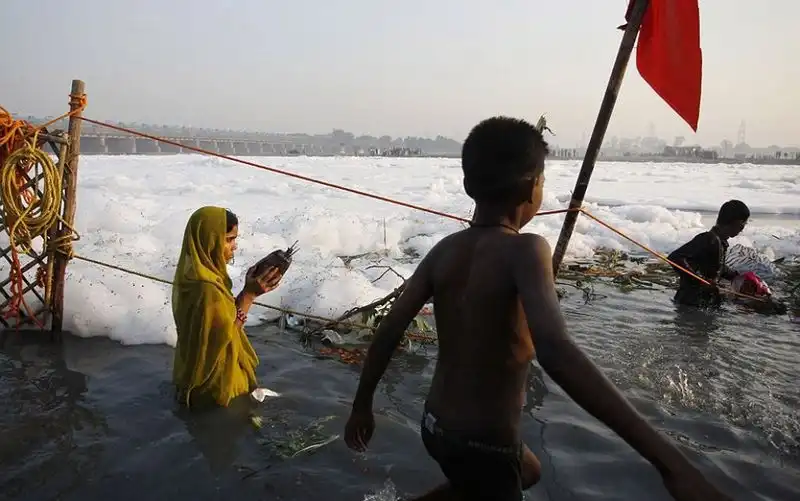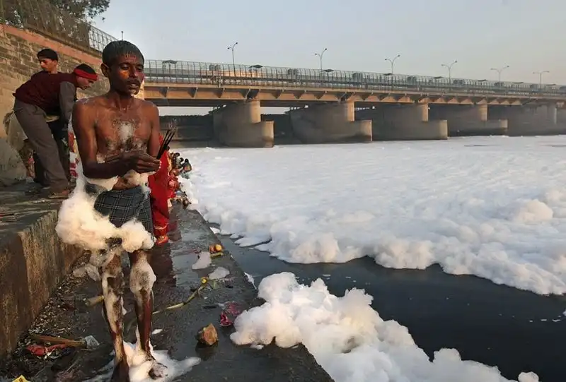 Этот обряд проводится и на реке Джамне воды которой настолько загрязнены, что поверхность полностью покрыта белым слоем пены.