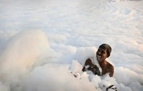 Пена образуется из-за промышленных стоков и массовой стирки белья многомиллионного населения.