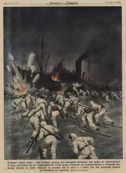 Группы немецких и финских лыжников осуществляют нападение на караван советских транспортных судов на Ладожском озере