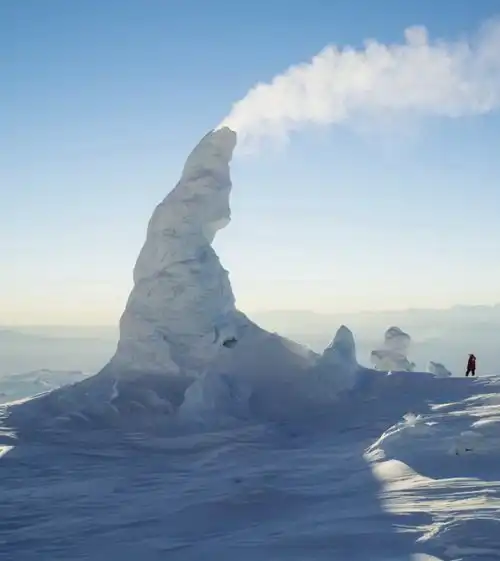 Сотни шпилей ледяных башен, расположенных на горе Эребус (высотой в 3 800 метров над уровнем моря), выглядят как однодневная щетина на лице гиганта. Постоянно действующий вулкан, пожалуй, единственное место в Антарктиде, где огонь и лед встречаются, взаимодействуют и создают нечто уникальное охватывающее обе их природы.