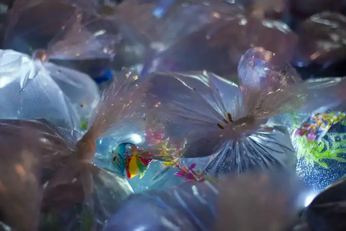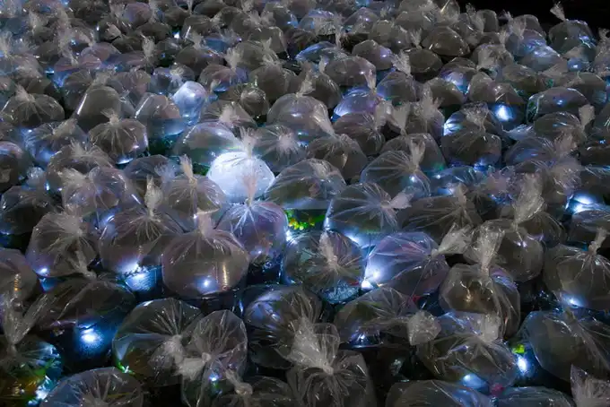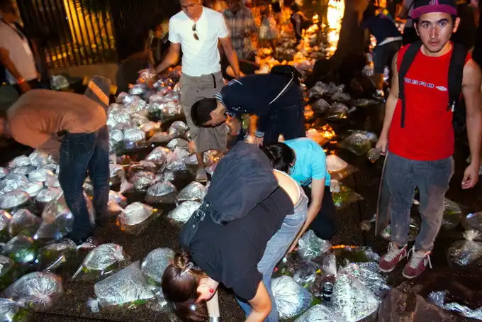 Новая инсталляция Luzinterruptus называется "Карманная река" и состоит из 2000 пакетов с водой, в которой плавает рыба. Это еще один призыв беречь окружающую среду, с которым, как обычно, выступает эта группа художников.