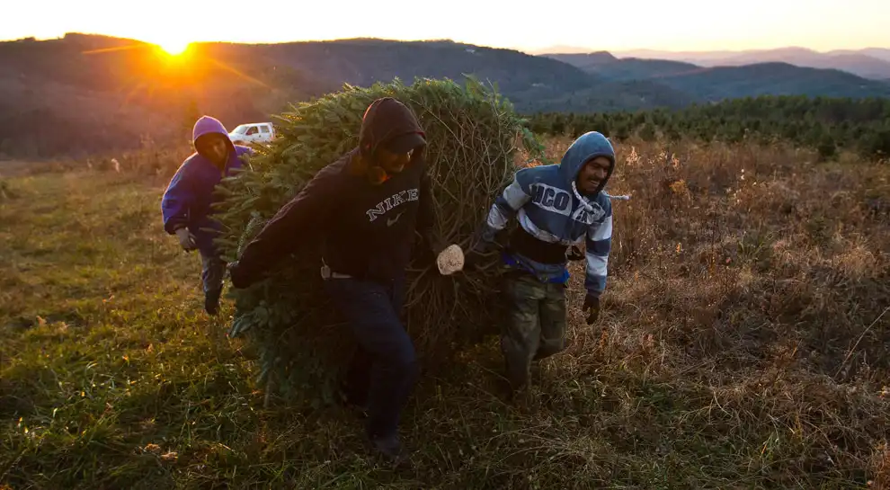 Рабочие несут спиленную ёлку по полю на ферме «Omni Farm» в Запад Джефферсоне, Северная Каролина, 17 ноября 2012 года.
