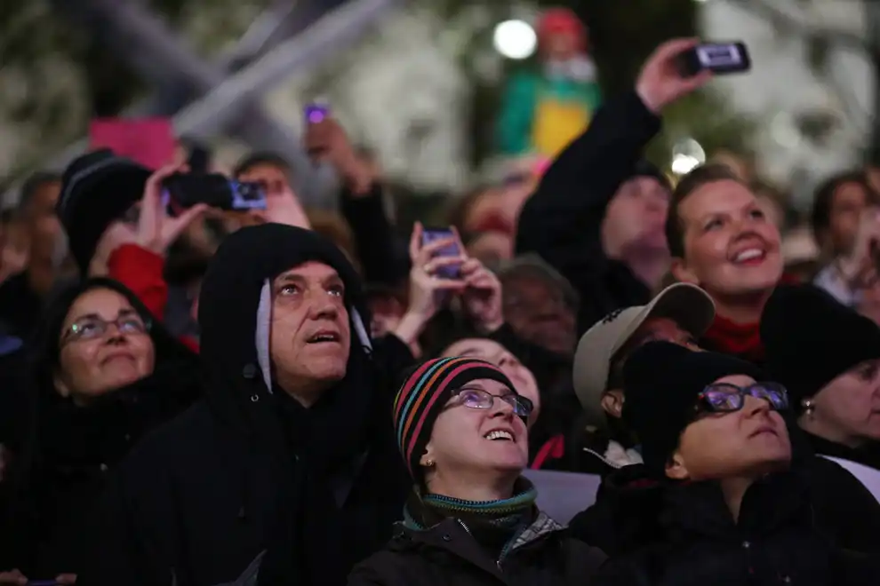 Зрители смотрят на сцену во время презентации рождественской витрины Macy’s на площади Геральд-сквер в Нью-Йорке, 15 ноября 2012 года.