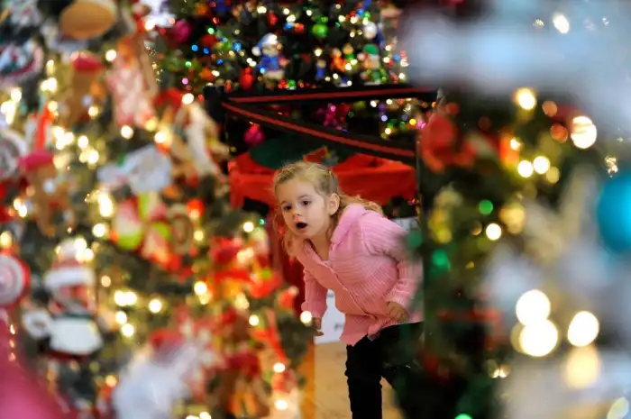 Девочка разглядывает наряженную рождественскую ёлку в Дирборне, штат Мичиган, 25 ноября 2012 года.