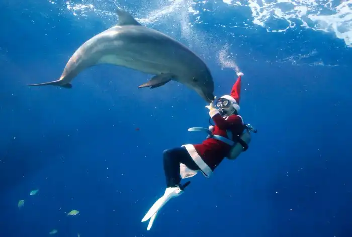 Водолаз в костюме Санта Клауса плавает с дельфинами в парке развлечений «Hakkeijima Sea Paradise» в Йокогаме, Япония, 27 ноября 1012 года.