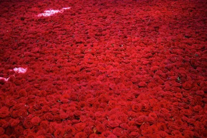 Какое-то время мы восхищаемся красотой алых роз, да еще в таком количестве.