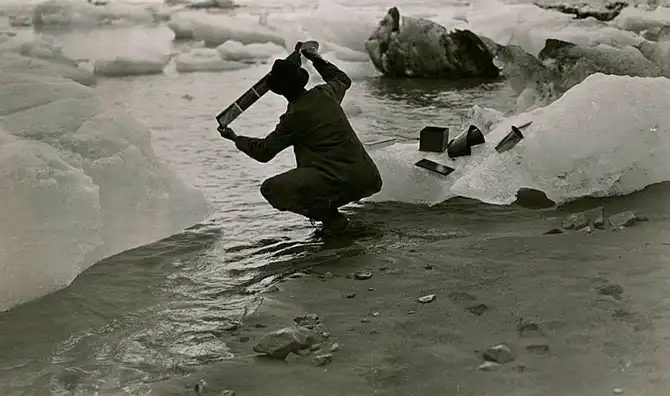 1909 год. Фотограф на Аляске моет пленку со снимками в талой воде.