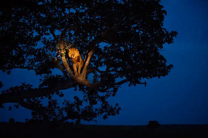 Интересная фотография льва в парке королевы Елизаветы в Уганде.