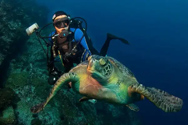 Биолог National Geographic и морская черепаха у острова Кокос, Коста-Рика.