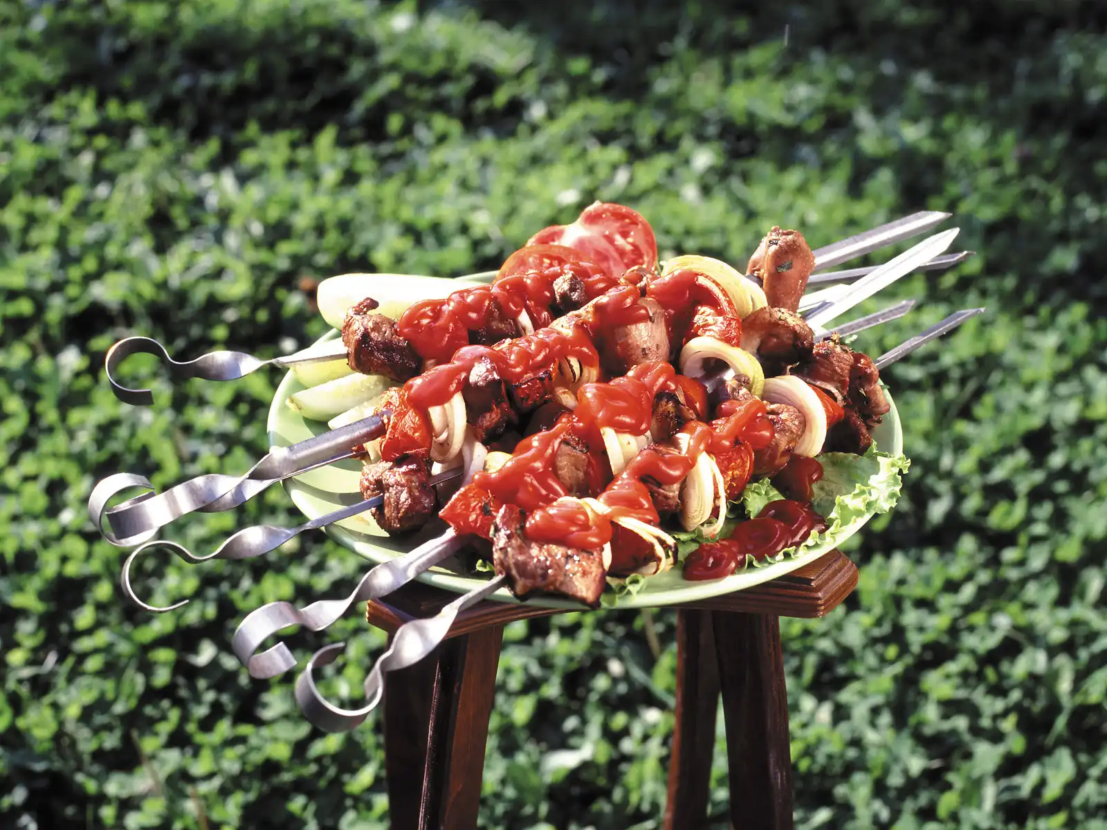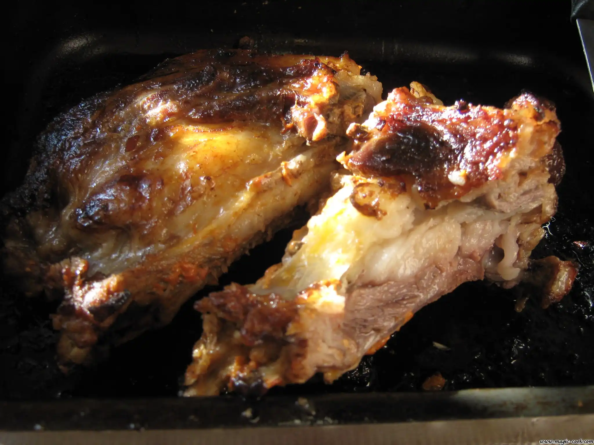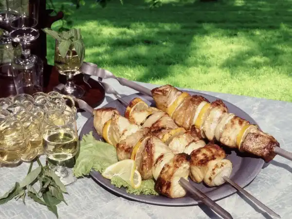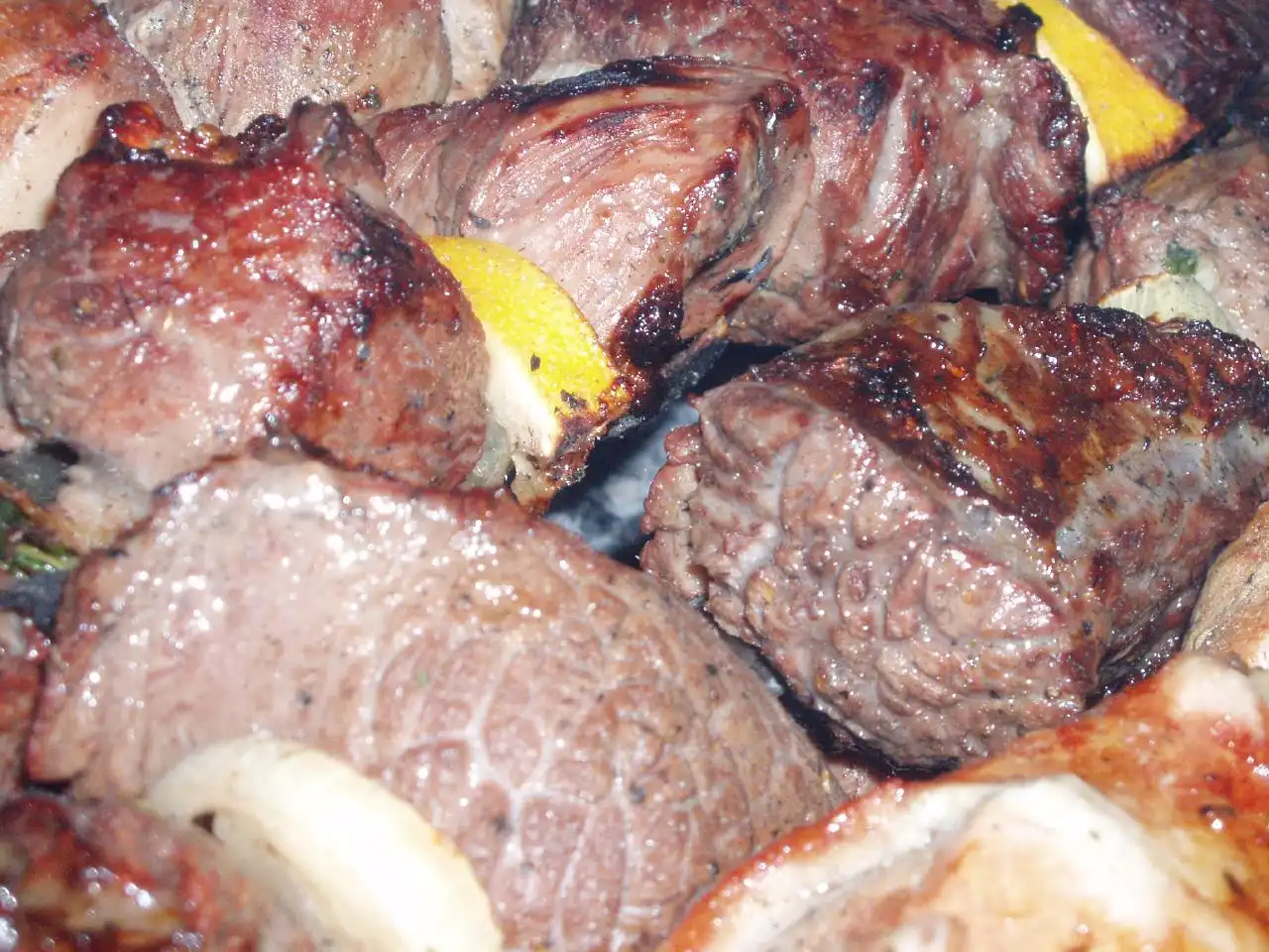 При подаче на стол на мясо кладут лук и поливают соком и жиром, полученными при жаренье мяса.