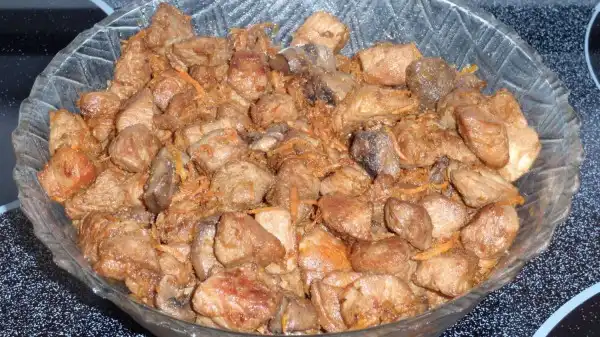 На 500 г говядины - 4 луковицы, 2-3 ст. ложки смальца, соль, перец по вкусу.