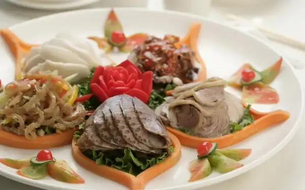 Обжаренное мясо нарезают ломтиками поперек волокон, кладут на тарелку вместе с гарниром (жареный или отварной картофель, картофельное пюре, настроганный хрен), поливают соком, образовавшимся при жаренье, и растопленным сливочным маслом. Рядом с гарниром кладут соленый или консервированный огурец.