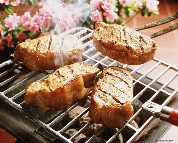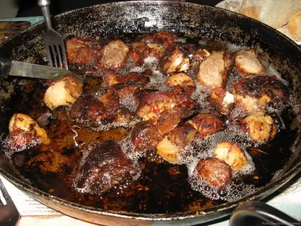 На большой сковороде сильно разогреть жир. Мясо посолить, посыпать перцем, сразу же положить на горячий жир и поджаривать каждую сторону 3-4 мин. до образования румяной корочки; внутри мясо должно быть розовым. К концу жаренья прибавить масло. Куски положить на сковороду так, чтобы между ними были промежутки.