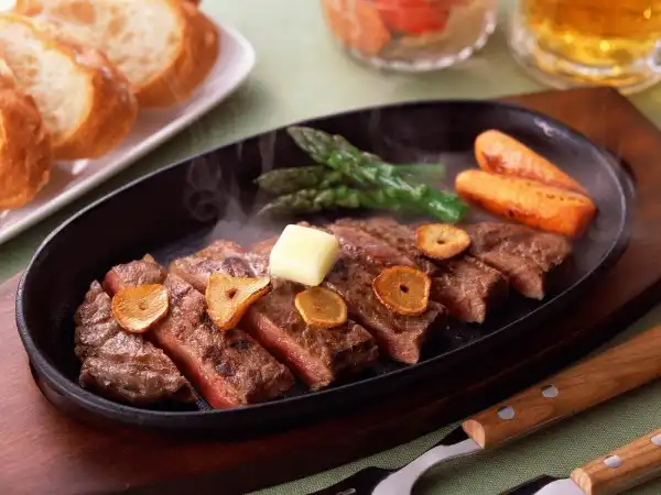 При подаче на стол к мясу на гарнир дают жареный картофель, строганный хрен и поливают соком и жиром, полученным при жаренье мяса. Приготовленное мясо можно подавать с яйцом, которое кладут на каждый кусок в виде яичницы-глазуньи (бифштекс с яйцом).