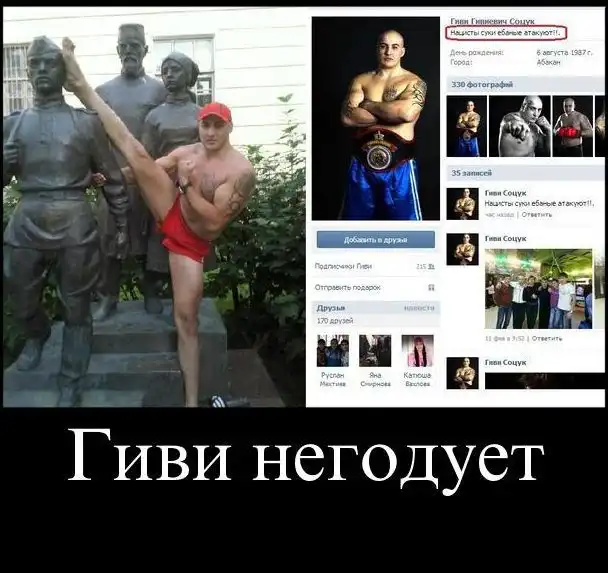 На фото чемпион России по кикбоксингу Гиви Соцук задирает ногу на голову
